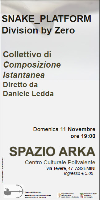 “Snake_Platform” è un progetto di Daniele Ledda sull’improvvisazione. È un collettivo di composizione istantanea composto da musicisti attori e performers, che utilizza un proprio repertorio di segnali e regole di interazione. È nato con il supporto del progetto Improring Sardegna.